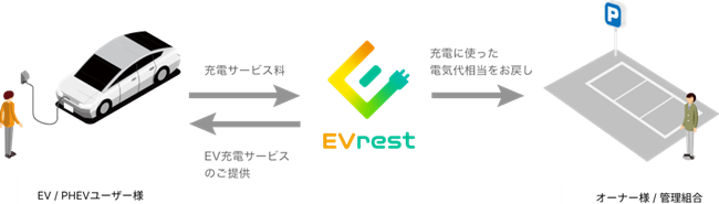 EVrestは、専用のEV充電制御盤とQRコードを駐車場に導入することで、EV充電環境を提供するサービスです。スマホでQRコードを読み取る仕組みで、オーナー様から個人のEVユーザー様への課金を可能にし、利便性の高い充電環境を実現します。
